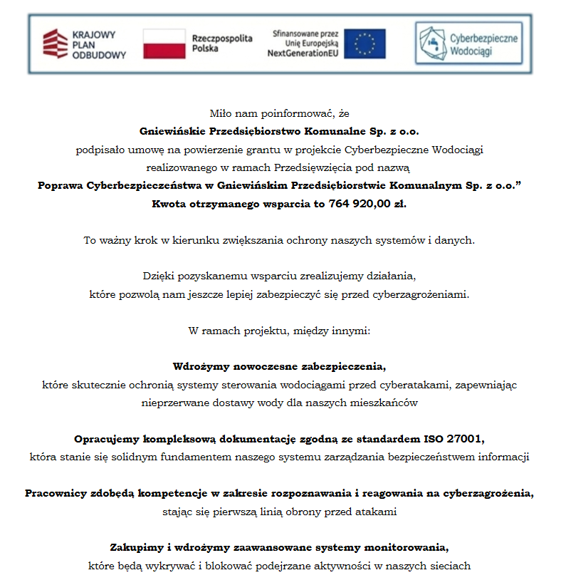 Grant: „Poprawa Cyberbezpieczeństwa w Gniewińskim Przedsiębiorstwie Komunalnym Sp. z o.o.”
