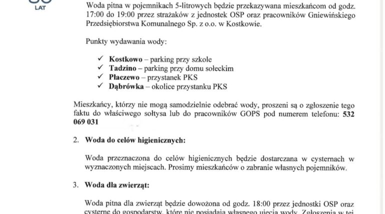 💧 Woda pitna w pojemnikach 5-litrowych będzie przekazywana mieszkańcom CODZIENNIE w godzinach 17:00–19:00 przez strażaków OSP oraz pracowników Gniewińskiego Przedsiębiorstwa Komunalnego Sp. z o.o. w Kostkowie.